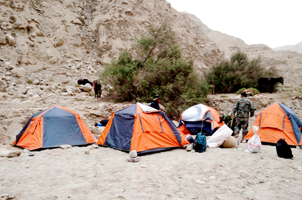 因無人區(qū)交通條件極差,許多地方一天之內(nèi)無法到達(dá),需要經(jīng)常性地“打游擊”,地質(zhì)隊(duì)員們備好騾馬、帳篷和干糧,行軍一至兩天才能進(jìn)入工作區(qū)域。他們駐扎在茫茫大山之中,只有咸澀的鹽堿水可以飲用,干硬的馕,需要用地質(zhì)錘敲碎才能下咽。身體的疲勞已經(jīng)不是問題,每個(gè)地質(zhì)隊(duì)員的精神狀態(tài)才是支撐他們的最后一道脊梁。為了節(jié)省“游擊”時(shí)間,盡快結(jié)束“游擊”工作,大家每一天的工作都安排得滿滿的,早上6點(diǎn)頂著寒風(fēng)爬出帳篷,晚上9到10點(diǎn)披著星光返回營地,在星空下吃著咸水掛面。一次“打游擊”需要5到7天的時(shí)間,這其中的每一天都是對(duì)團(tuán)隊(duì)的嚴(yán)峻考驗(yàn)。